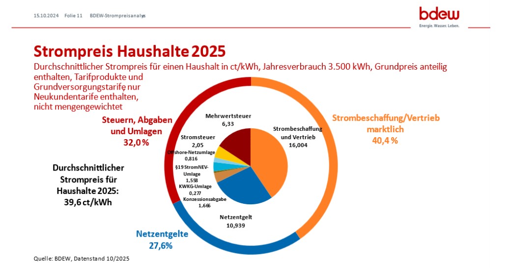 Der dritte große Baustein sind staatlich veranlasste Bestandteile. Steuern, Abgaben und Umlagen machen ein knappes Drittel des Strompreises aus, im Jahr 2025 waren das 12,7 Cent pro Kilowattstunde. Dazu gehören die Stromsteuer nach dem Stromsteuergesetz, die Konzessionsabgabe an Kommunen oder die Mehrwertsteuer.